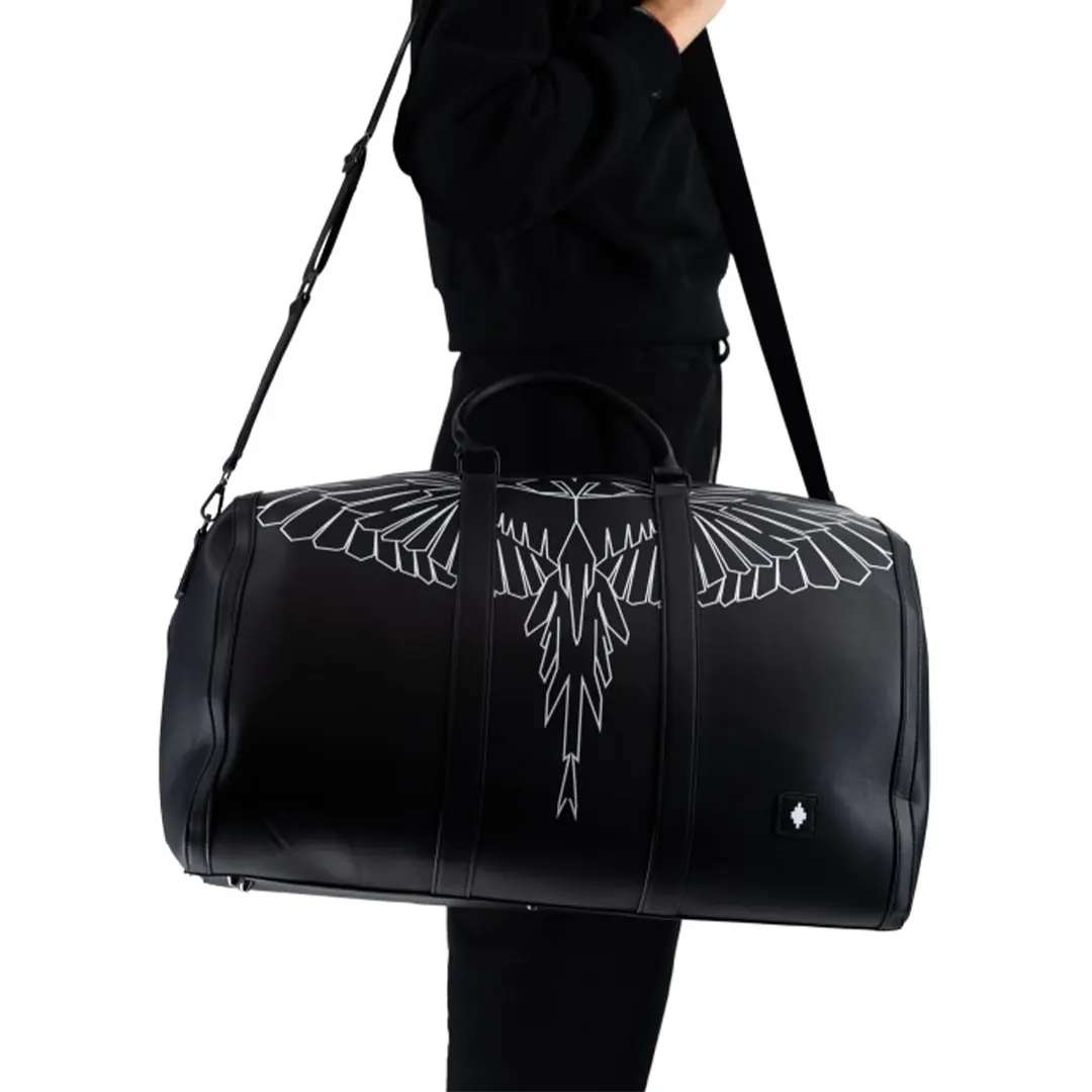 MARCELO BURLON COUNTY OF MILAN Borsone nero per uomo e donna. Design in ecopelle,chiusura con zip applicata superiormente, tracolla regolabile e removibile, manici superiori, piedini metallici applicati sul fondo, patch logata applicata sul fondo e logo wings bianco stampato frontalmente. Internamente: unico scomparto, tasche a soffietto e tasca con zip.