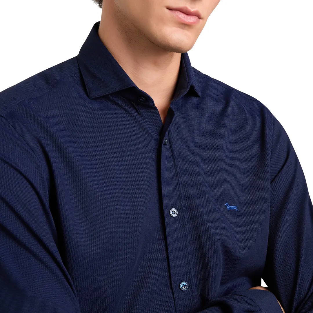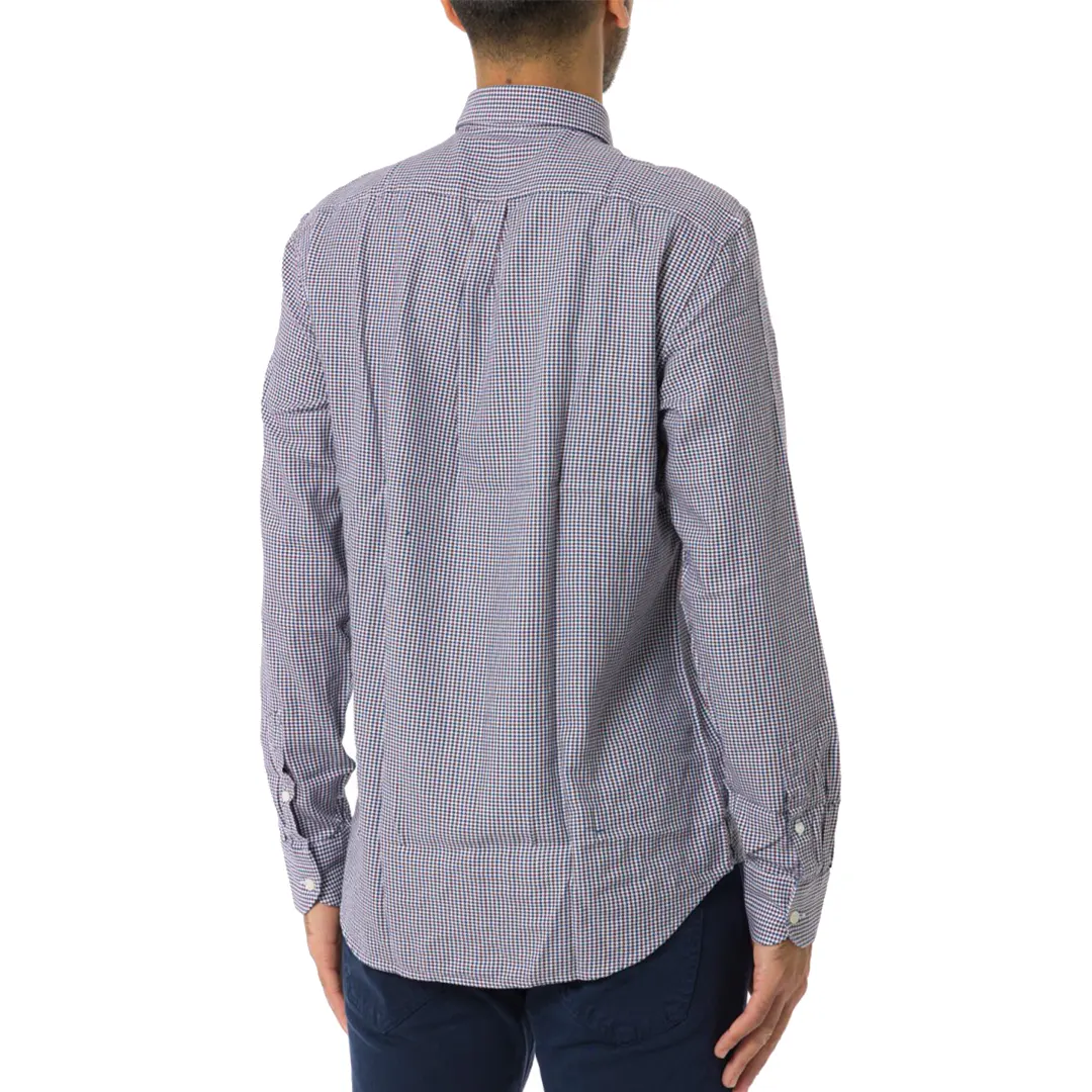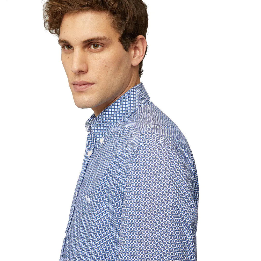 Questa camicia da uomo con un pratico collo con bottoncini porta un’autentica ventata di aria fresca, grazie anche alla sua leggera composizione in popeline di cotone. Il capo presenta un sottile micro motivo stampato all-over, adatto anche a essere abbinato a look da ufficio, e mostra, sul petto, l’iconico simbolo del brand, il bassotto, qui ricamato in una tonalità a contrasto.