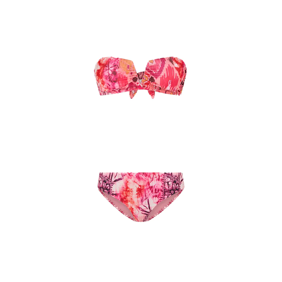 Bikini fascia a V con slip fianco coulotte in tessuto Lycra opaca a fantasia. Capo dotato di imbottitura interna estraibile e ricami in cotone su slip, realizzato con stampa all-over.