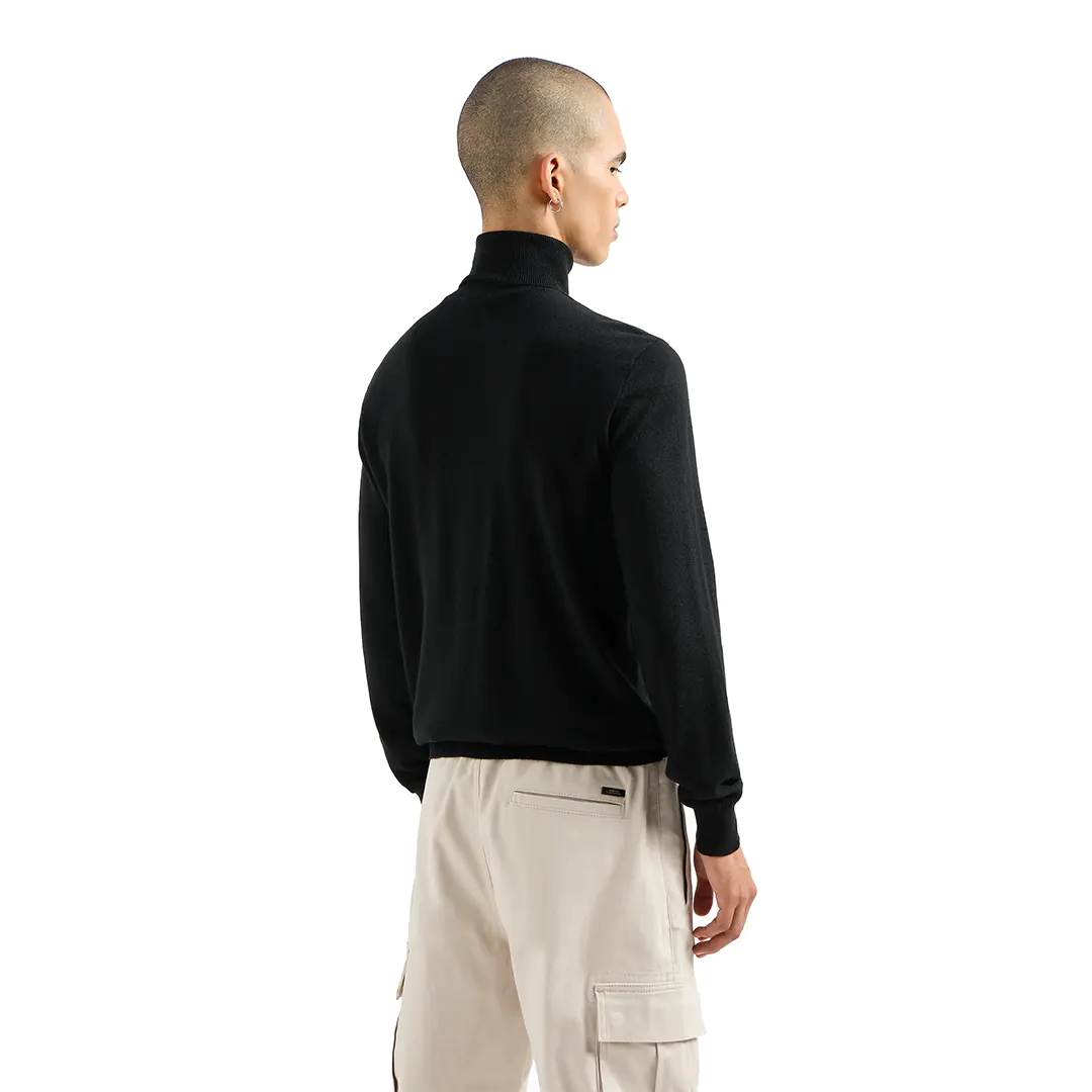 Linee semplici e alta qualità per questo maglione dolcevita realizzato in mix di lana vergine e personalizzato dal logo tono su tono sul davanti.
