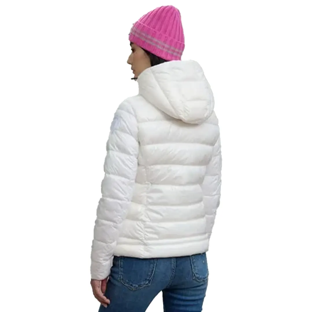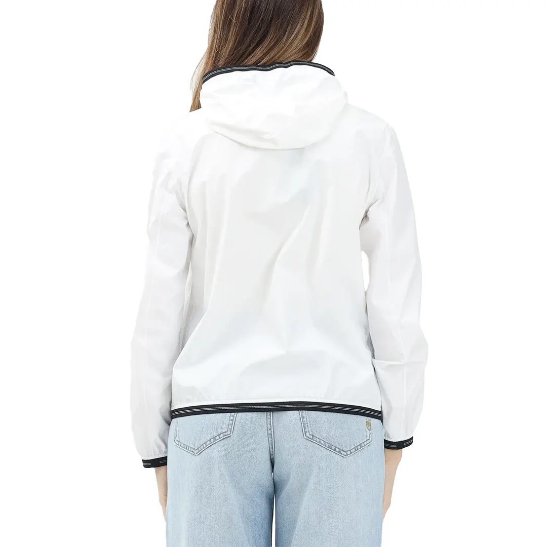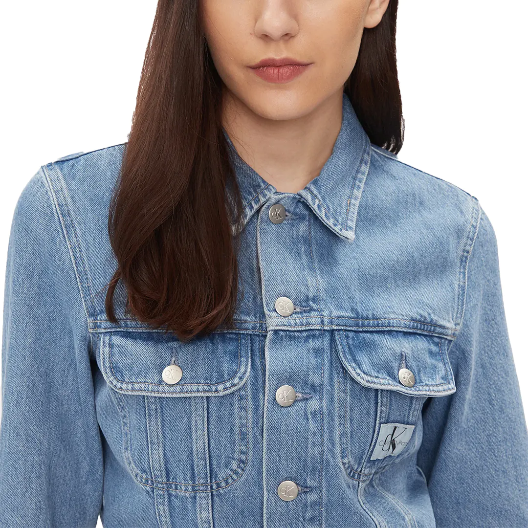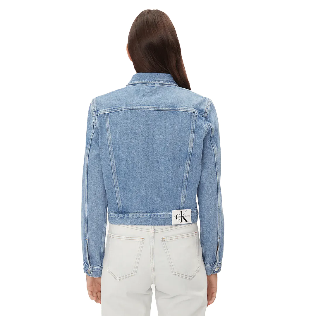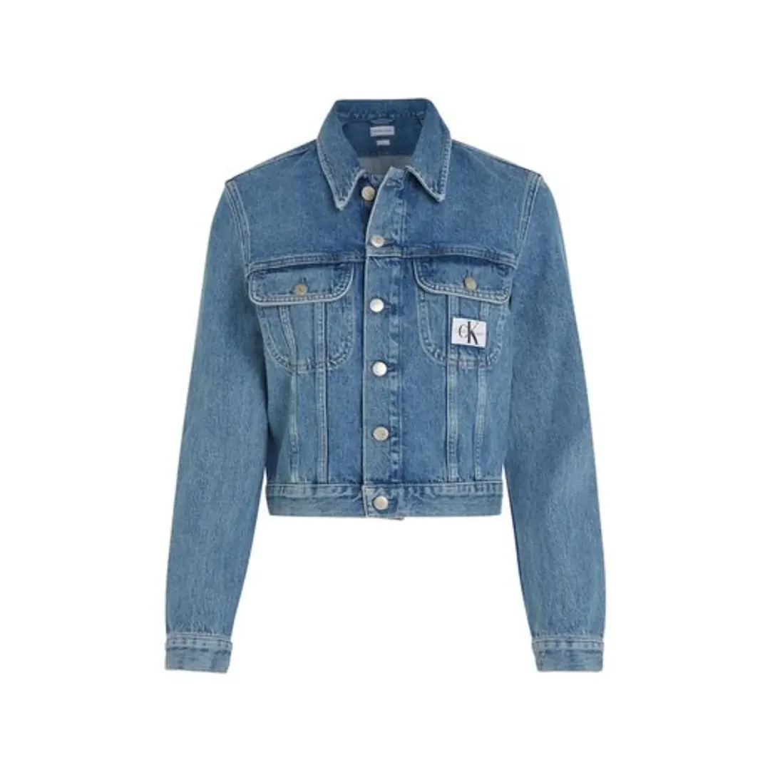 Giacca cropped in jeans con colletto, sul tasche frontali con patta e bottone, maniche lunghe con polsini, chiusura sul davanti con bottoni, etichetta logo sul petto, salpa logata sul retro