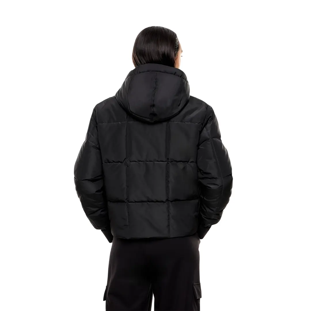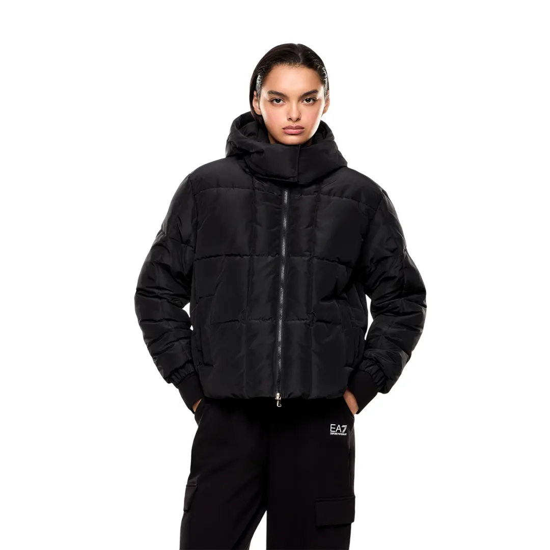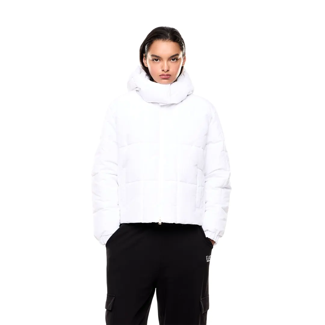 Giubbino donna con cappuccio realizzata in nylon e caratterizzata dalla calda imbottitura in CALIDUM7. Il modello è movimentato dal motivo impunture a quadri. Questo capo è provvisto di pratico cappuccio e personalizzazione con patch scudetto sulla manica sinistra.