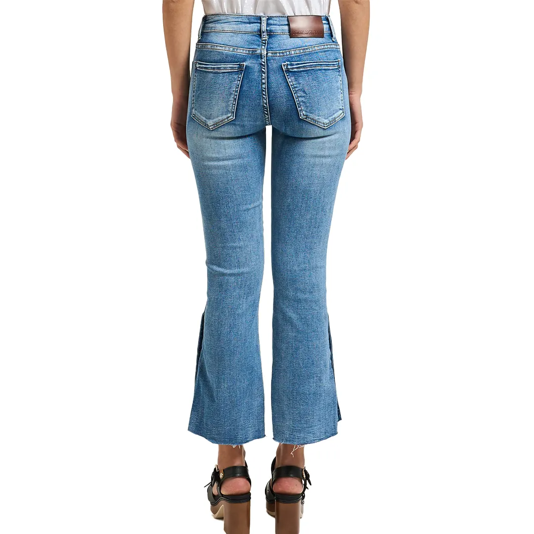 Jeans donna Denny Rose in denim a vita alta con fit flare cropped, lavaggio medio con schiariture, dettaglio con spacco laterale, bottoni sul fondo e salpa logata.