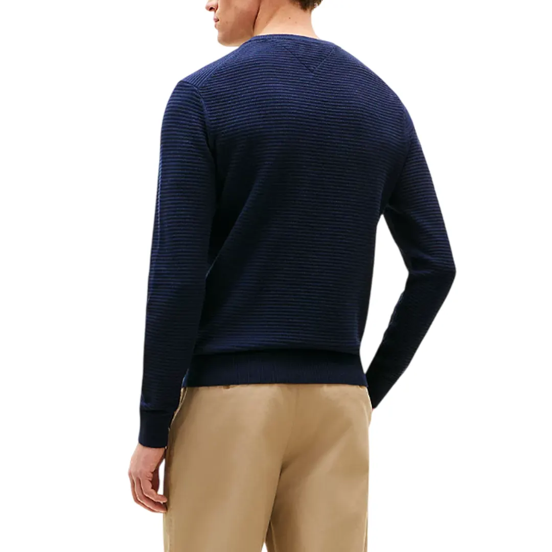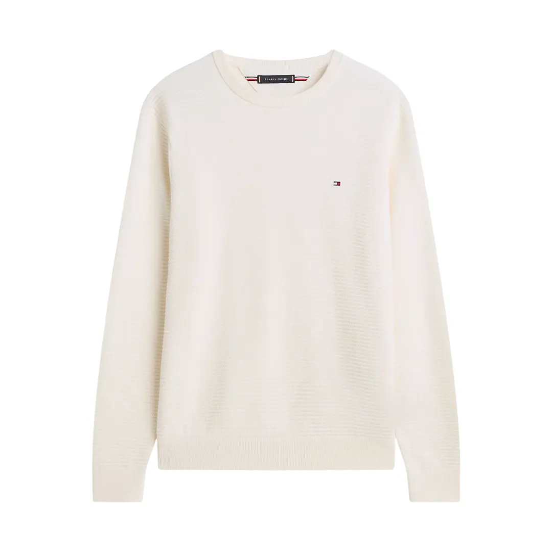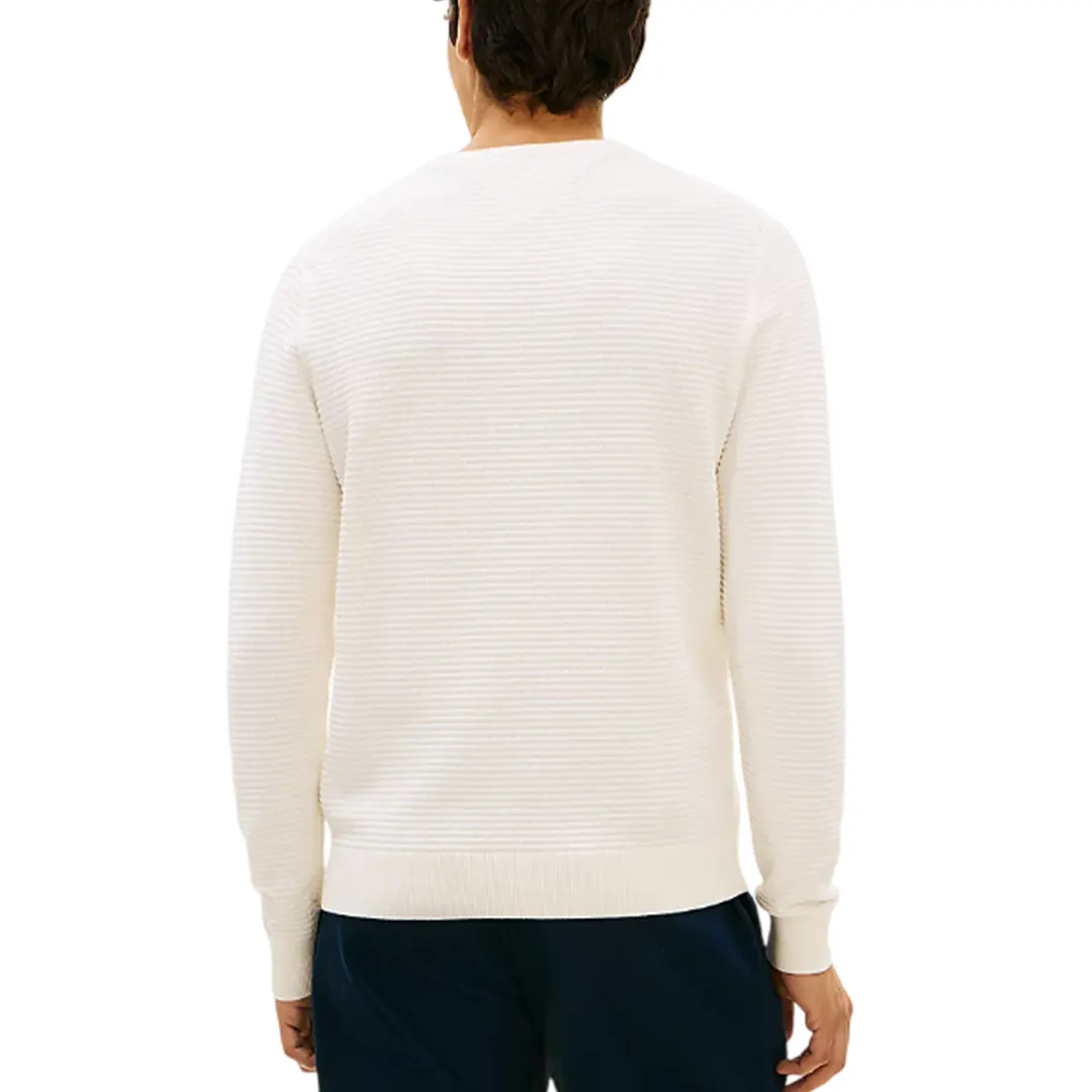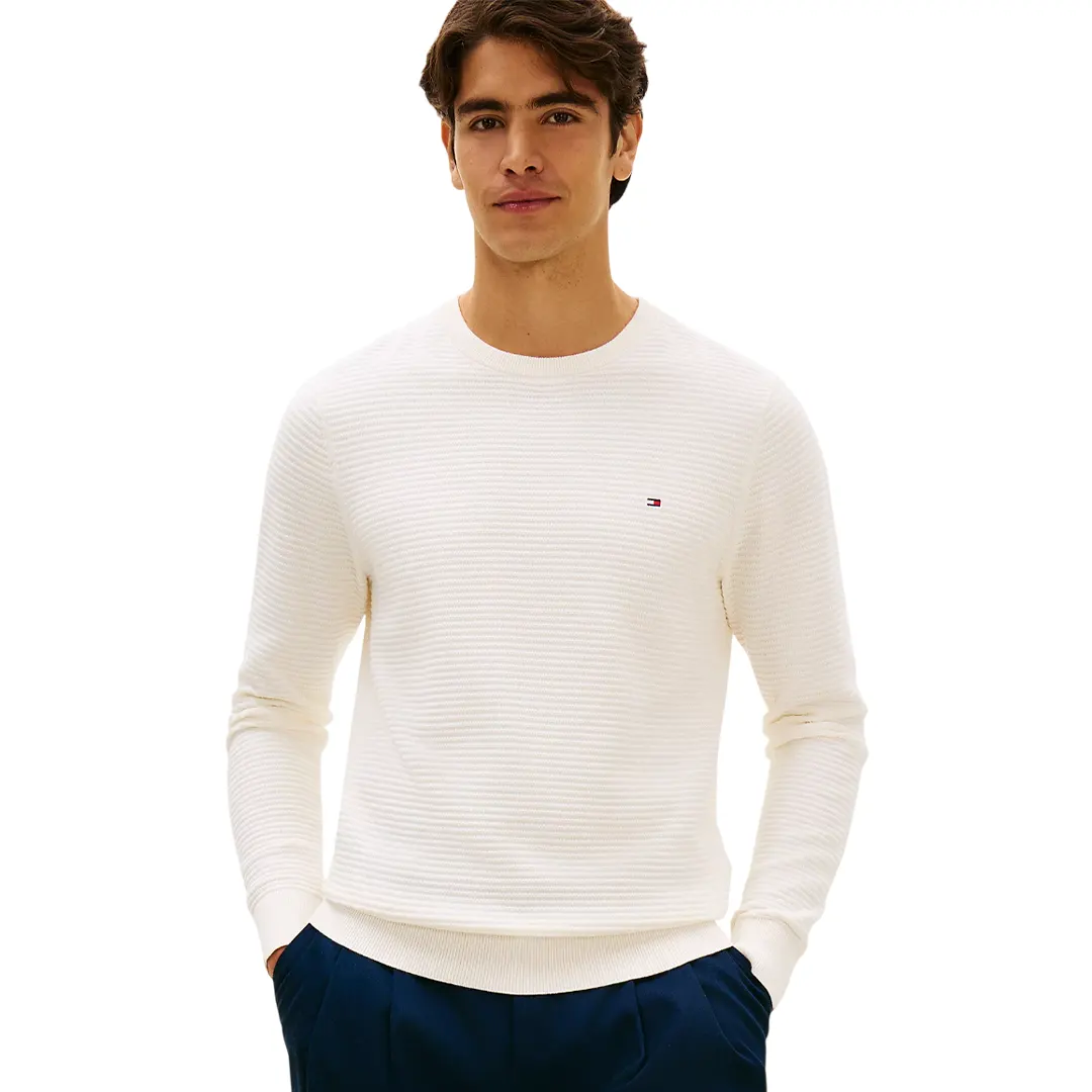 Il pullover è caratterizzato dalla lavorazione a maglia tramata, mentre la scollatura rotonda, i polsini e il fondo presentano la classica finitura a coste.