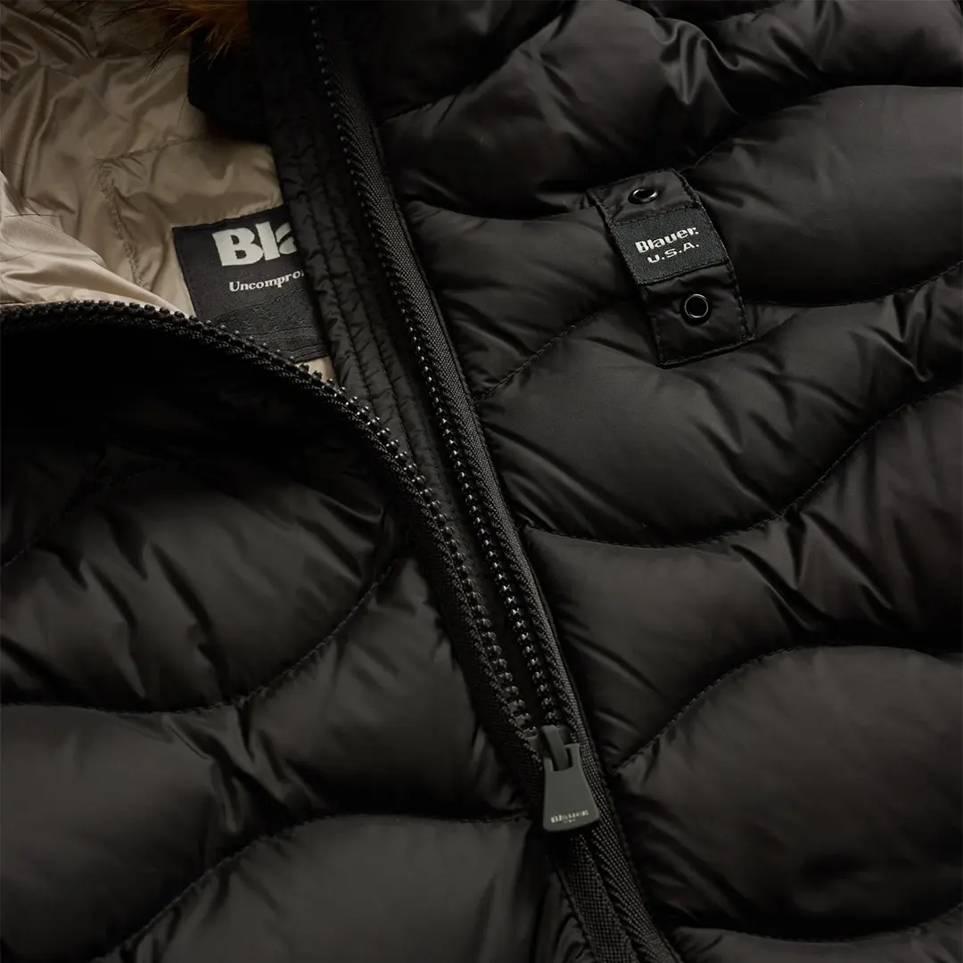 Caldo e cool: ecco il piumino perfetto. Il modello ha esterno in tessuto lucido trapuntato, chiusura con zip, tasche laterali e imbottitura calda in piumino.