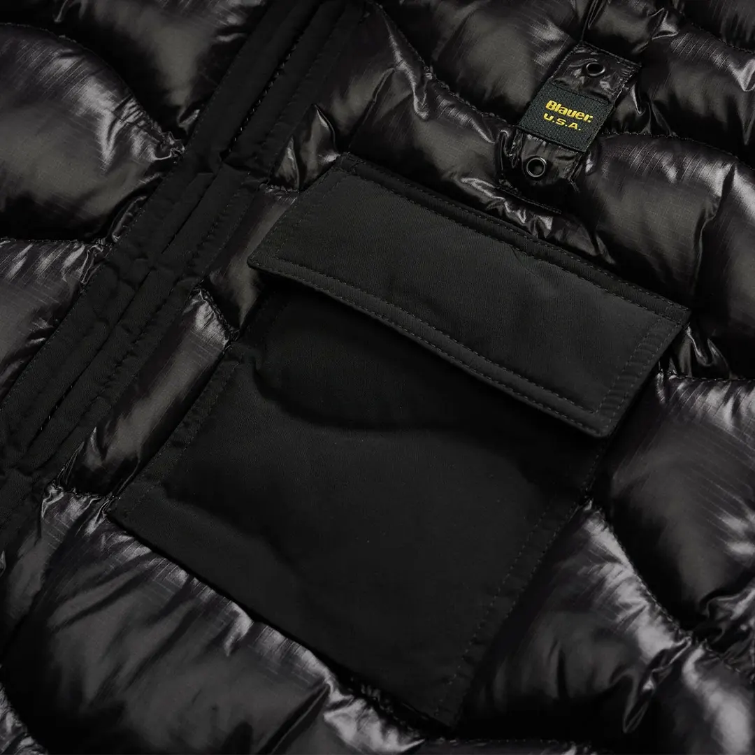 Inserti in taslan in tono sul profilo del cappuccio e delle zip e nel taschino applicato sul petto.