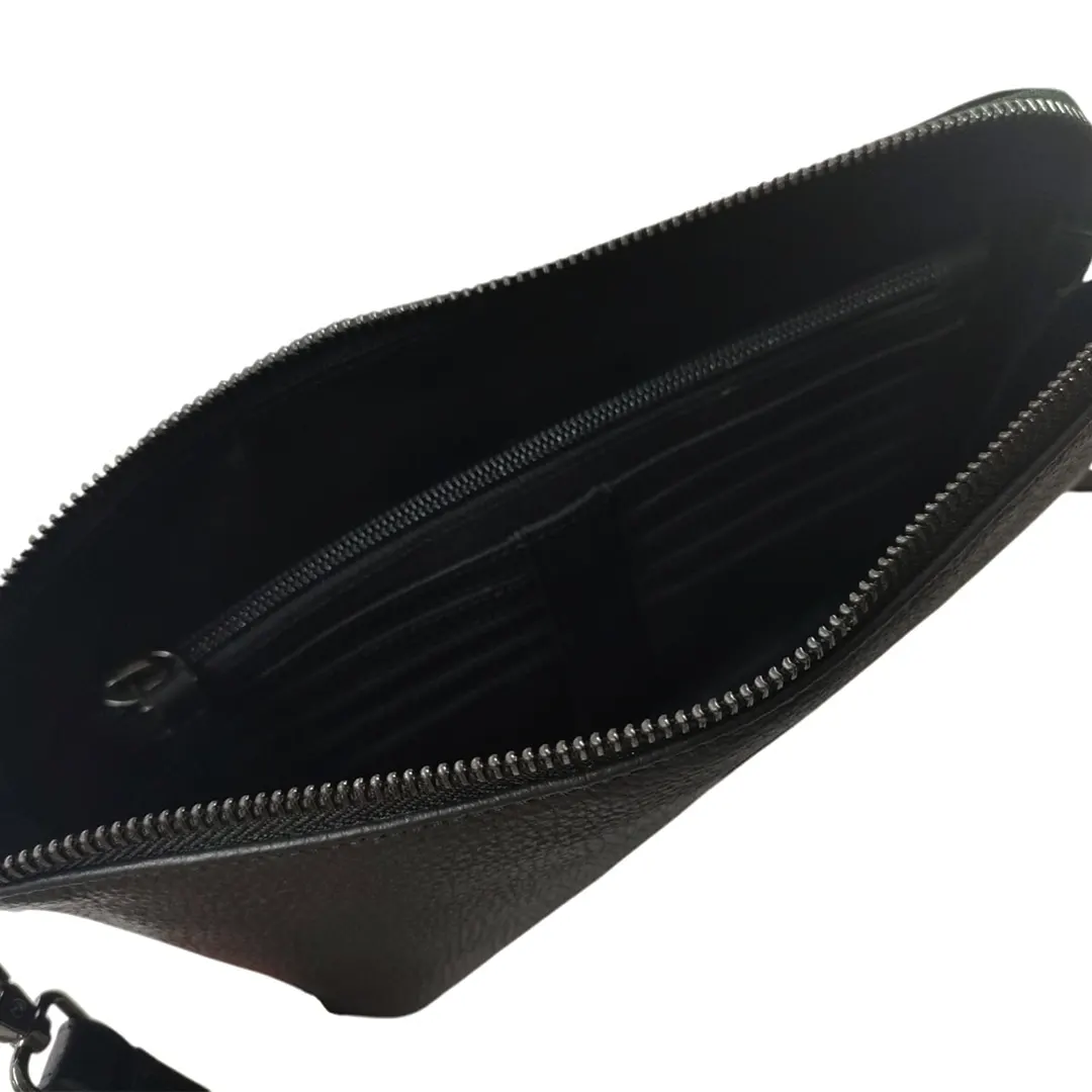 Dispone di un ampio scomparto principale con chiusura zip, tasca interna con chiusura a zip e tasca sul posteriore con clip calamita.