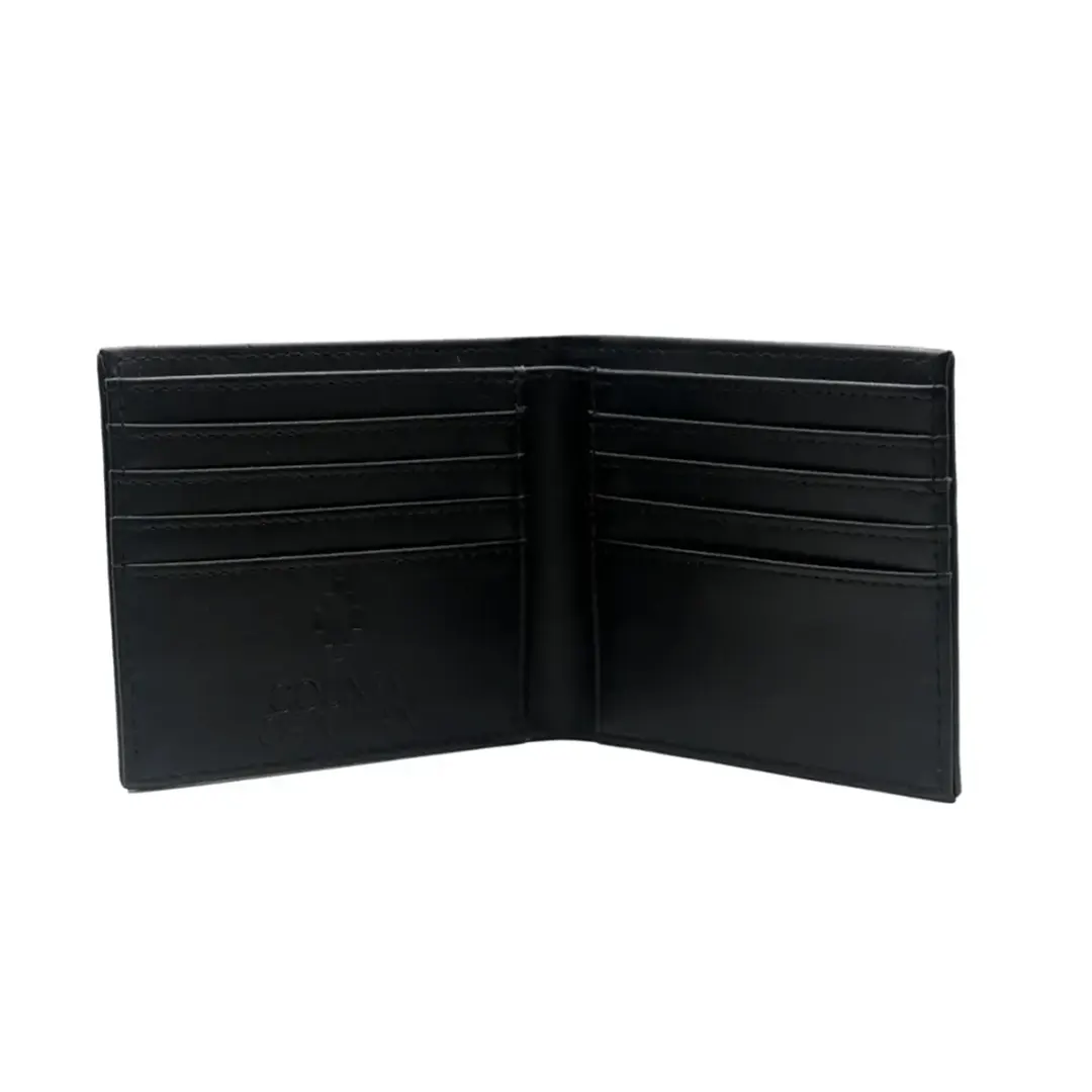 MARCELO BURLON COUNTY OF MILAN Portafogli nero da uomo con stampa. Il portafoglio Marcelo Burlon – County of Milan è un accessorio dallo stile essenziale e contemporaneo. Realizzato in materiale sintetico effetto pelle, presenta linee pulite e compatte. Sul fronte è impreziosito dal caratteristico logo geometrico BLUE WINGS, simboli iconici del brand. L’interno offre scomparti pratici per carte, banconote e documenti, garantendo funzionalità senza rinunciare al design. Perfetto per chi cerca un portafoglio moderno, versatile e con un tocco urban-luxury.