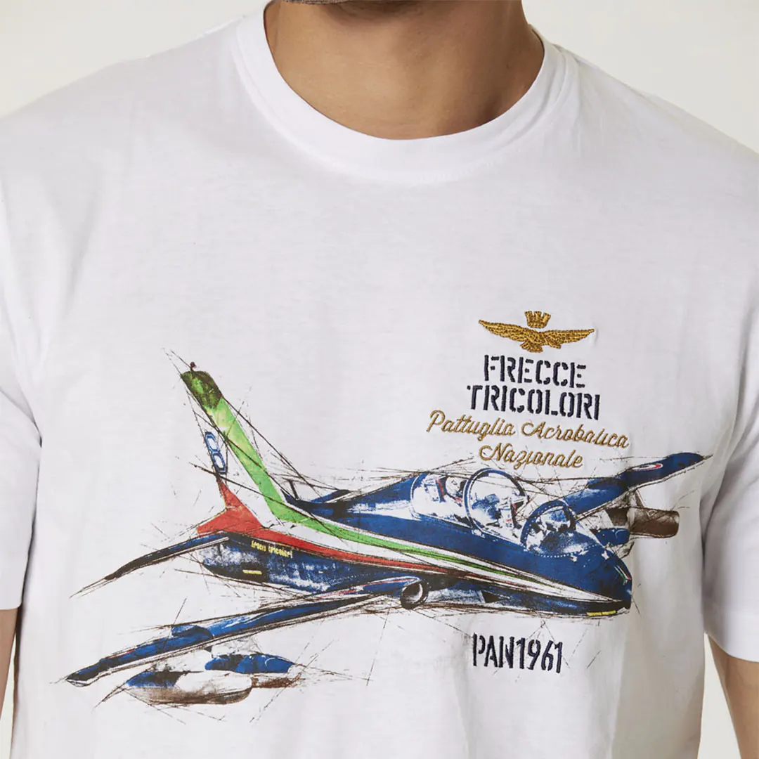La stampa che rifinisce questa t-shirt a maniche corte raffigura il velivolo utilizzato dalle Frecce Tricolori, l’Aermacchi MB-339 conferendo un tocco colorato a questo capo di ispirazione militare.