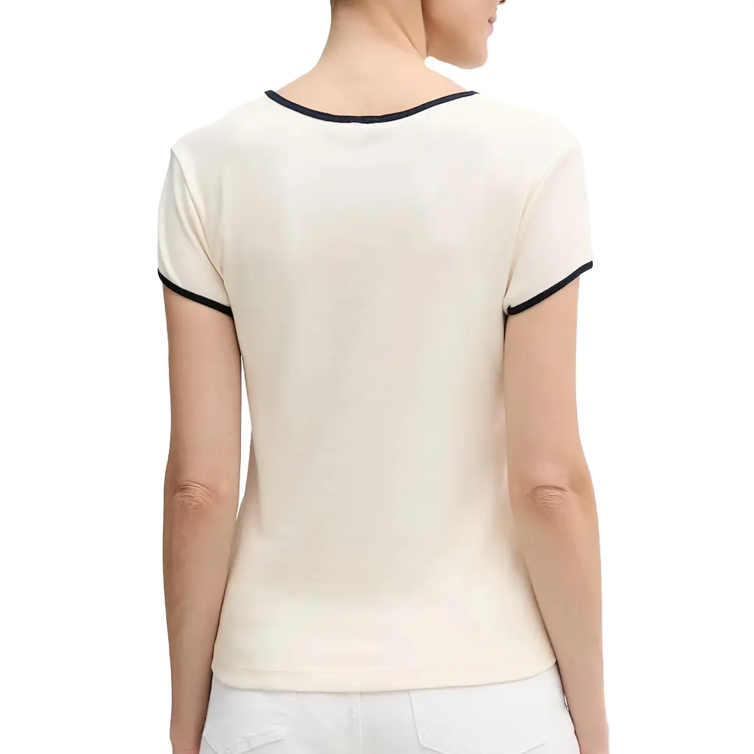 La T-shirt slim fit, con i bordi a contrasto sul collo e sulle maniche, richiama lo stile college rétro.